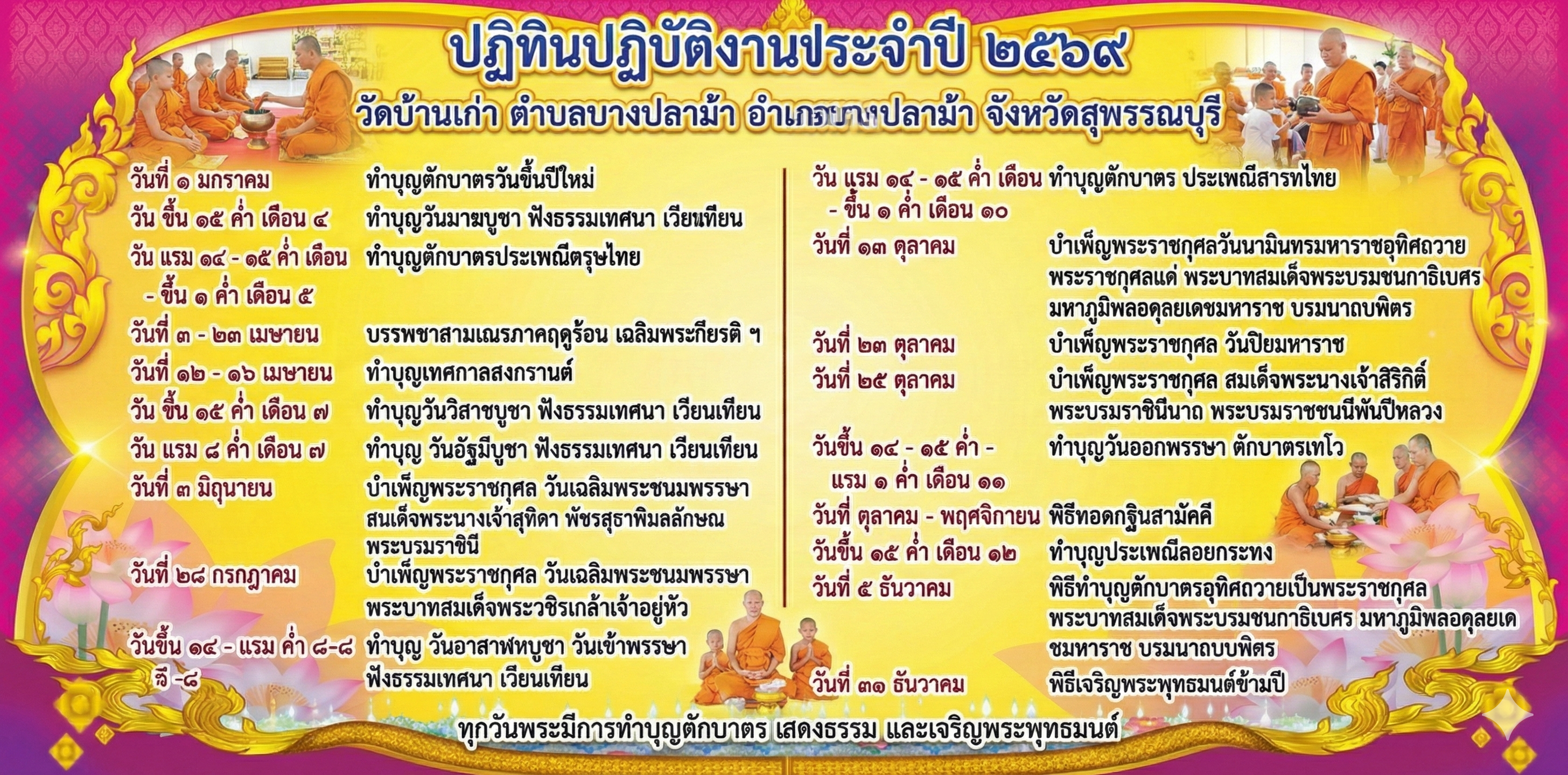 ปฏิทินปฏิบัติศาสนกิจประจำปี พุทธศักราช ๒๕๖๙ วัดทวิชาตาราม ตำบลโคกคราม อำเภอบางปลาม้า จังหวัดสุพรรณบุรี